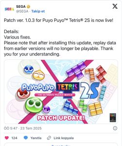 Sega, Sonic ve Yakuza gibi oyunlarla Switch 2’ye olan sevgisini çoktan gösterdi ve lansman oyunu Puyo Puyo Tetris 2S’e olan desteği de devam ediyor. Oyun piyasaya sürüldüğünde zaten saygın bir durumda olsa da, şirket oyun için bazı küçük güncellemeler yayınlamaya devam etti.